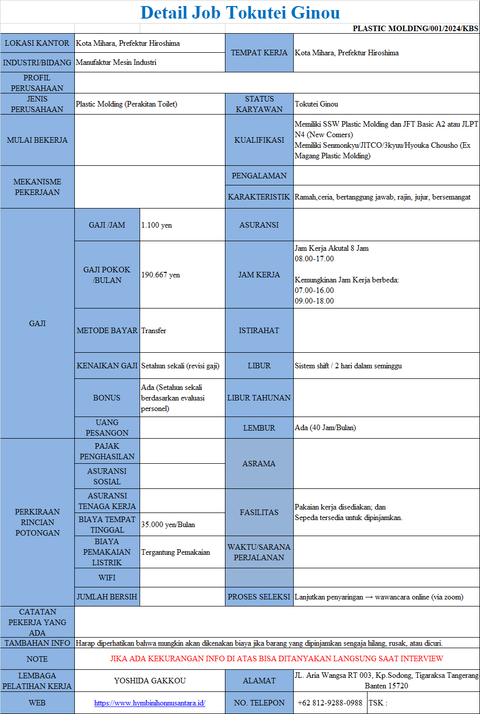 Status Kerja : Karyawan Kontrak Tokutei Ginou